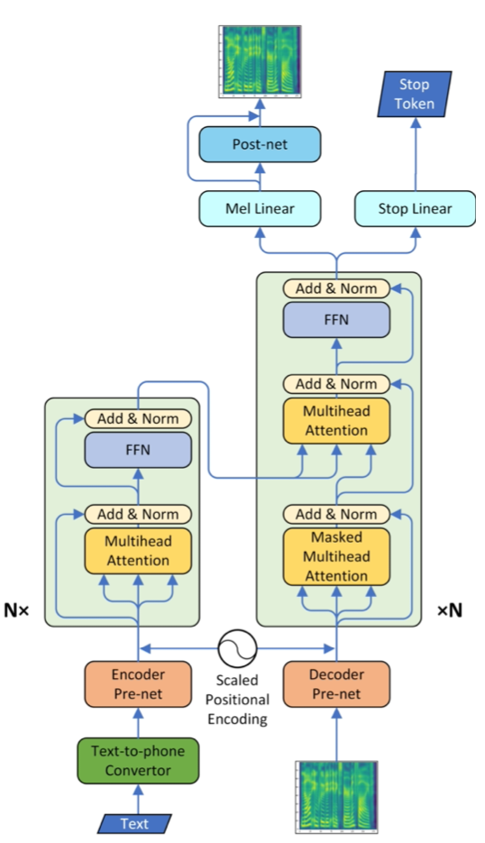 이 논문에서는 기본적으로 Tacotron2[Shen18]와 유사한 모델을 사용함. 고로 컴퍼넌트들은 유사한 형태로 되어 있지만 Tacotron2에서 사용한 LSTM 모듈이 모두 Transformer 형태로 바뀐 차이가 있음. 전체적인 구조는 아래와 같음.