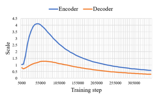 Different Positional Encoding Methods: Positional Encoding을 할 때 파라미터 알파를 곱해 encoder와 decoder각각 다른 스케일을 갖게 하였음. 아래는 훈련시 변화하는 파라미터 알파의 값을 보여줌.