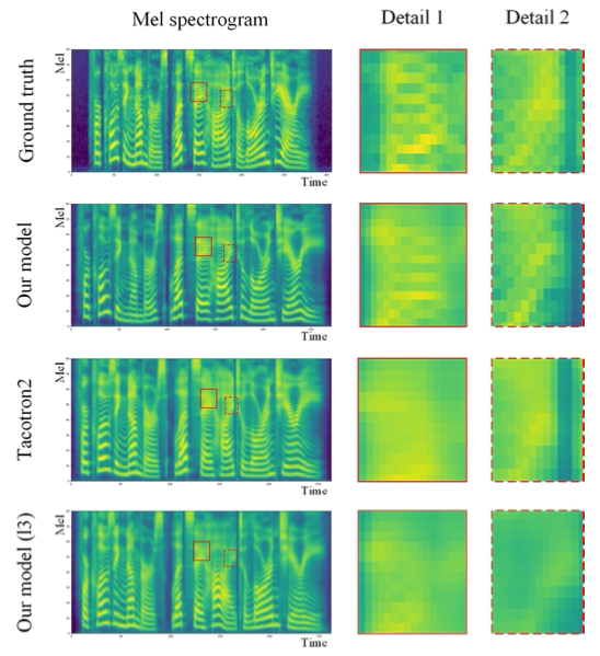 Training Time Comparison: 병렬로 훈련을 하면 얼마나 빨라질 수 있을까? Tacotron2과 비교한 결과 4.25 배정도 더 빠르게 훈련이 가능했음. 즉 Tacotron2에서는 훈련을 한 스텝할 때 1.7s정도 걸렸는데 여기에서는 0.4s정도 걸림. 하지만... 제안한 모델에서의 파라미터는 Tacotron2에 비해 두 배 정도 많음. 따라서 훈련하는 데에는 3일가량 (Tacotron2는 4.5일) 걸렸음.