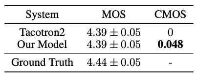 동점이 나와버렸음. 실망했을 거임. 그래서 다음으로 Tacotron2와 제안하는 모델의 결과 딱 두개만 놓고 비교를 하게 했음. 즉 Comparison mean option score (CMOS). 두 개를 들려주고 누가 더 나음? 을 [-3, 3](인터벌 1)로 측정한 결과 제안한 모델의 점수가 (살짝) 더 높았음!
