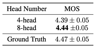 결과가 안좋아짐. 레이어가 늘어날 수록 결과를 점점 refine하는 결과를 얻을 수 있음(위에 멜스펙트로그램을 통해서도 알 수 있음). head수도 8개에서 4개로 줄이자,